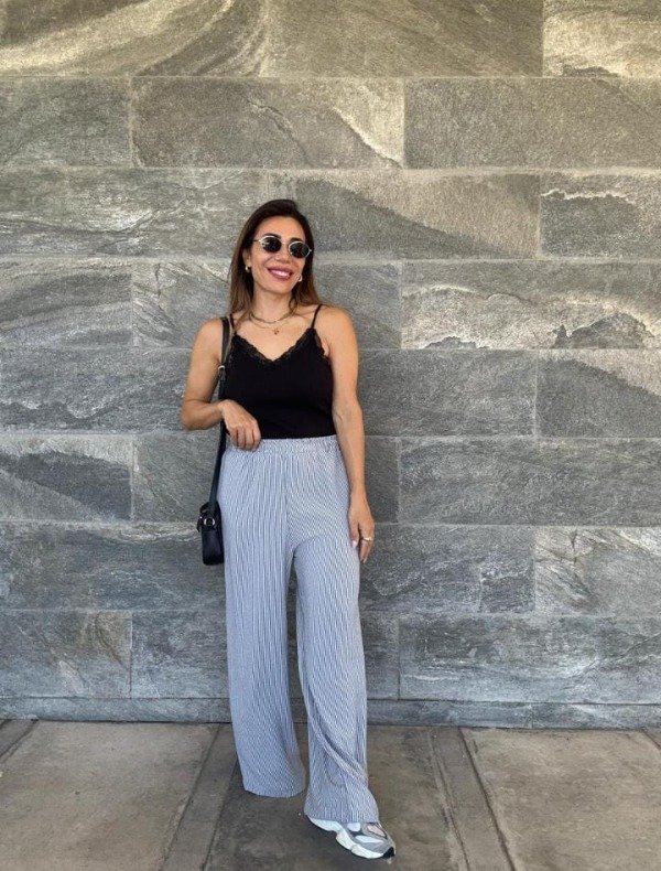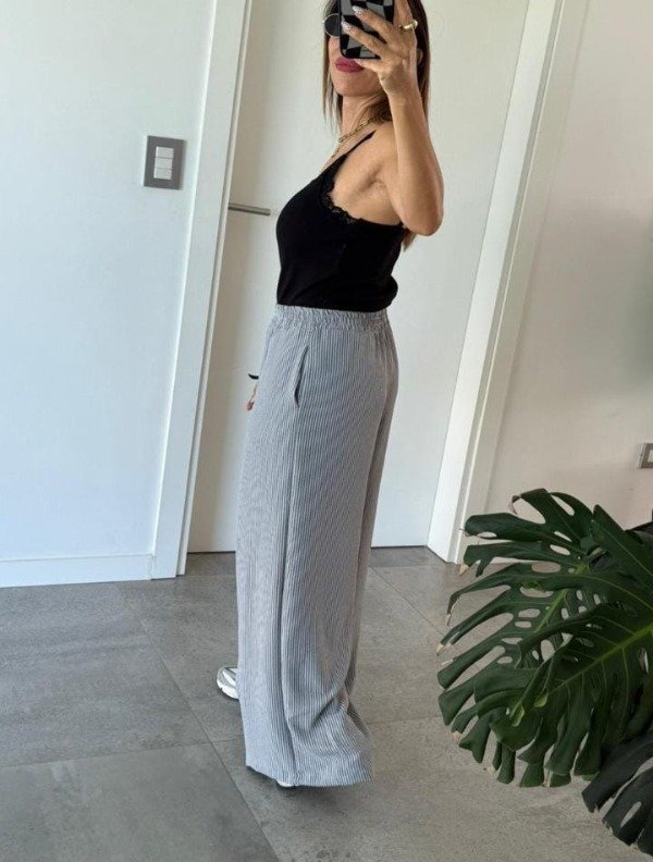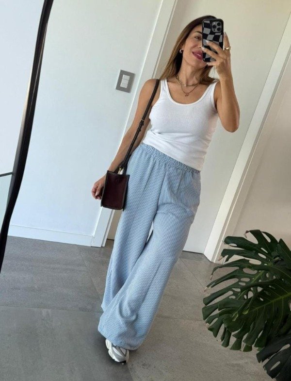 Este pantalón combina la elegancia de las rayas con la comodidad de un tejido pensado para el verano. Las rayas finas azules sobre base blanca son un clásico atemporal que puedes llevar de la oficina (con una camisa) al after office (con un top).