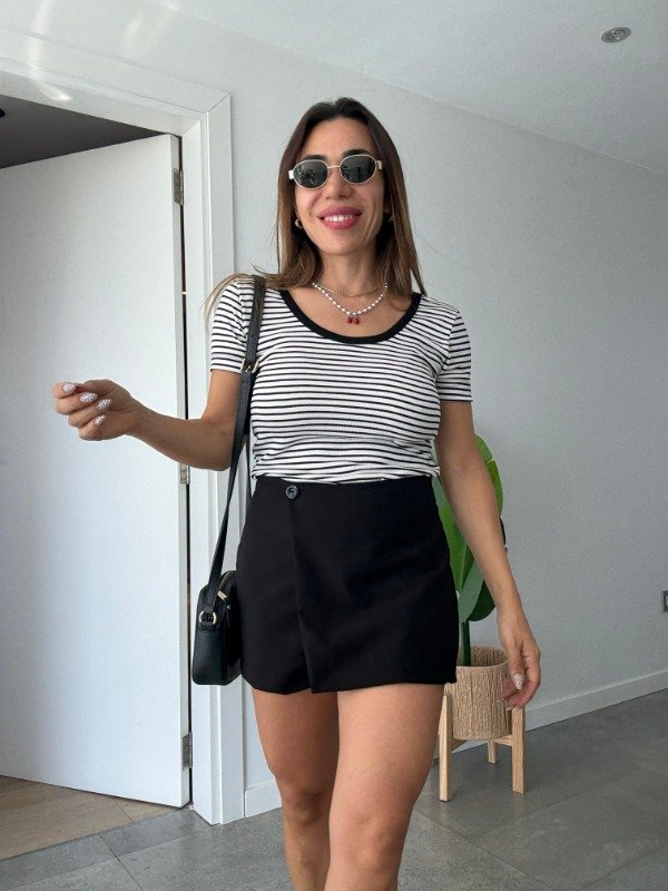 ¡La solución perfecta para un look cómodo, elegante y versátil! Este short pollera combina la apariencia formal y pulcra de una falda cruzada (wrap skirt) con la seguridad y el confort de un short.